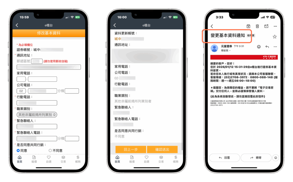 - 再次確認「分公司」:從富果前往元富證券開戶,分公司只會是:臺北市城中分公司。