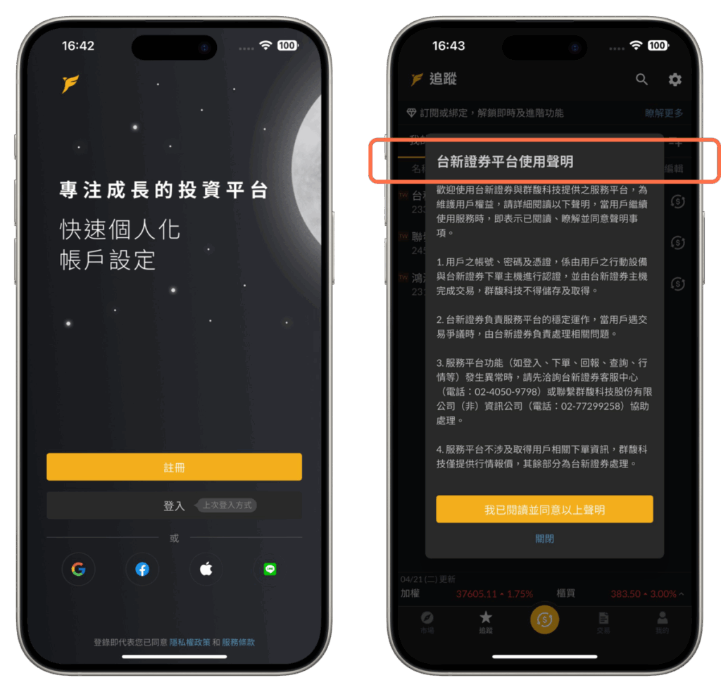 若您是首次登入富果會員,會出現「平台使用聲明」,請點選「我已閱讀並同意以上聲明」以利進行下一步。