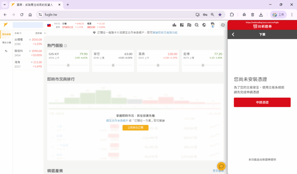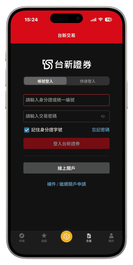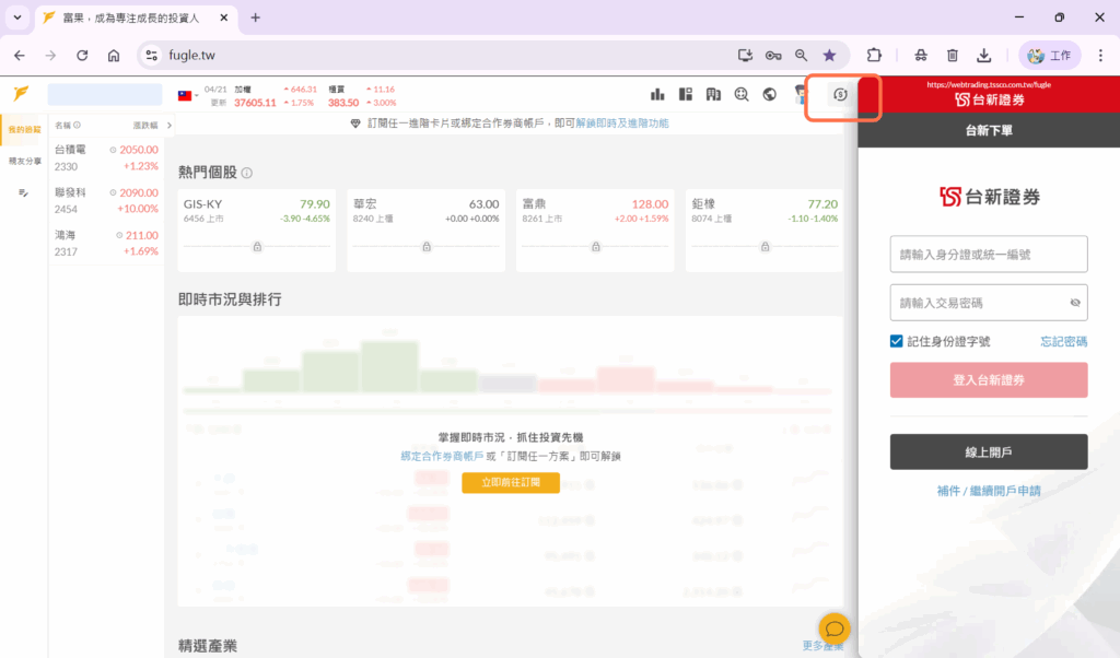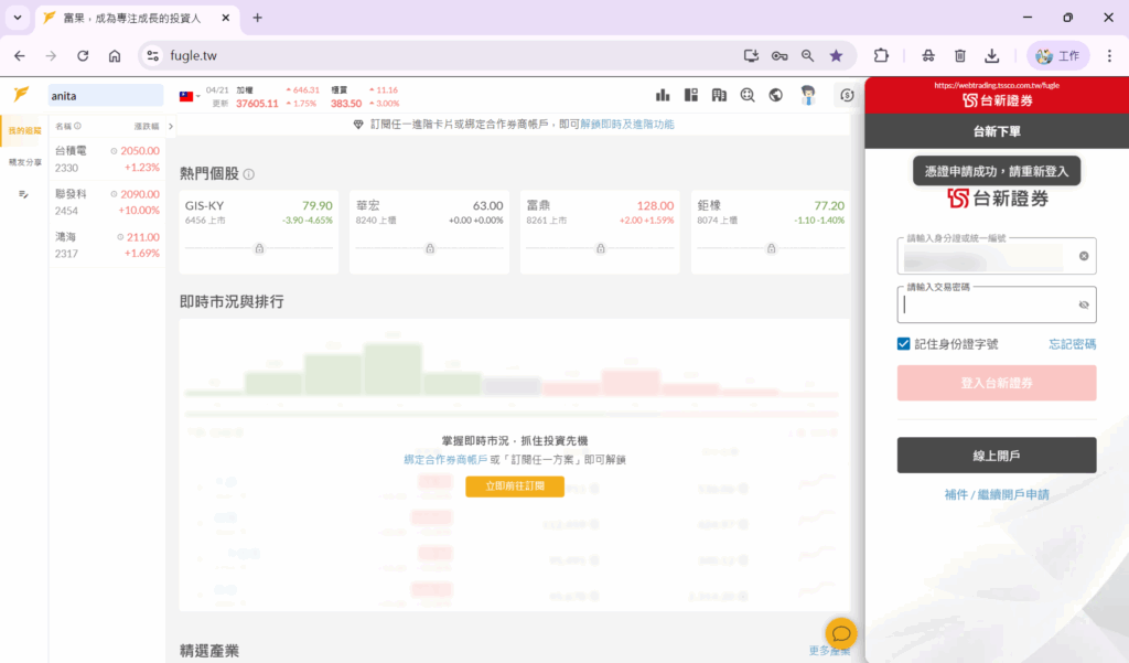 到下單頁面,「台新證券」,輸入身分證字號與證券交易密碼進行登入