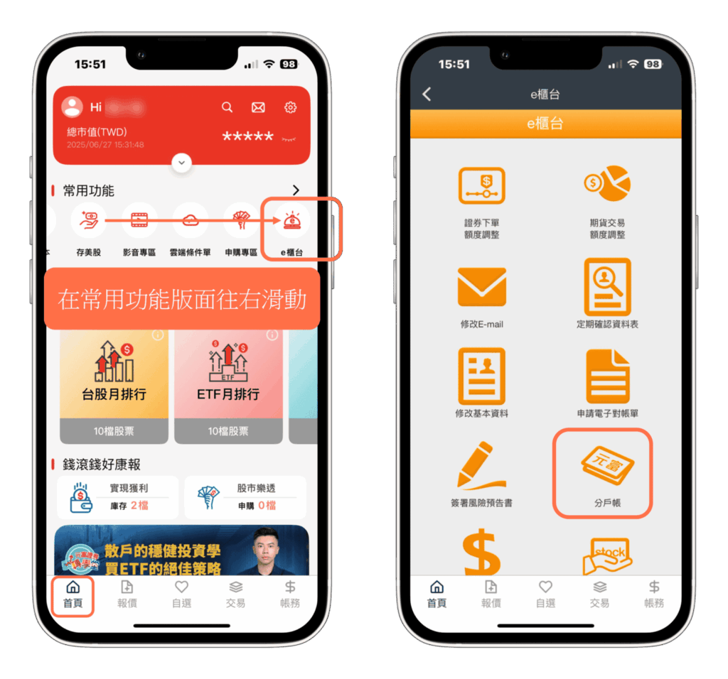 完成元富證券開戶後,請透過以下步驟找到您的分戶帳號,並聯絡您的入金銀行辦理約定轉帳: