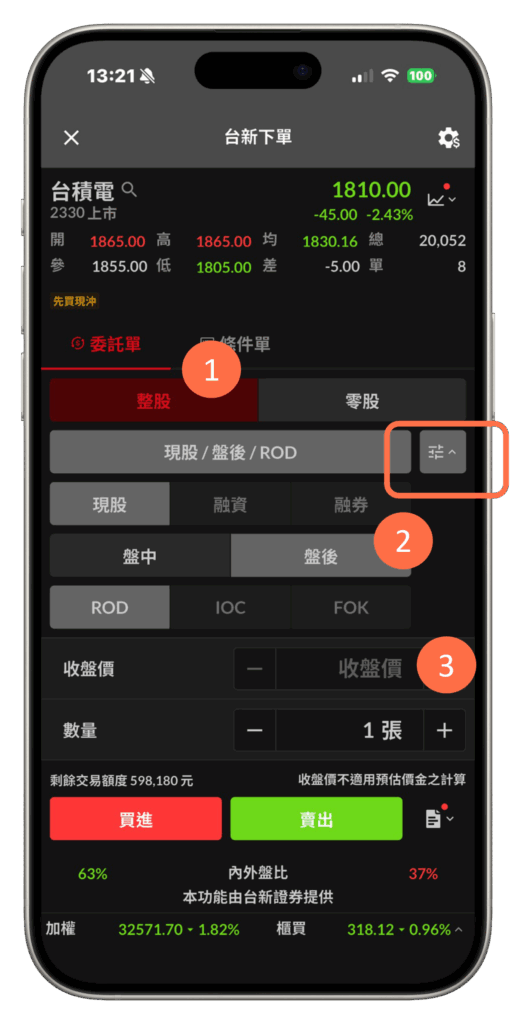 - 下單頁面選擇「現股」「盤後定價」